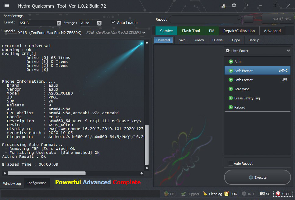 Asus X01B (ZenFone Max Pro M2 ZB630K) Safe Format successfully done by Hydra Tool