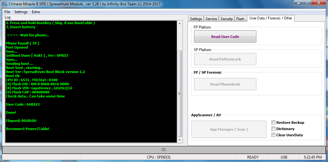 http://Chinese Miracle II [SPD module] v 1.26 Set mode to : SPD6531 Operation : Read User Code [ v1.26 ] 1. Remove battery. Insert USB cable 2. Press and hold BootKey ( Skip, if use BootCable ) 3. Insert battery ==== Wait for phone... Phone found! [ 39 ] Port Opened Sync... InitBoot Done [ 0x81 ] , Ver : SPRD3 Sync... Sending boot ... Boot Sent , starting... Boot Ver : Spreadtrum Boot Block version 1.2 Boot Ok CPU ID : 6531 , FDLStat : 0100 [0] Flash DIE : 00C8 0060 0016 0000 [0] Flash VEN : GigaDevice , GD25LQ32 [0] Flash CAP : 00400000 Check data... Can take some time User Code : 668223 Done! Elapsed: 00:00:06 Reconnect Power/Cable!