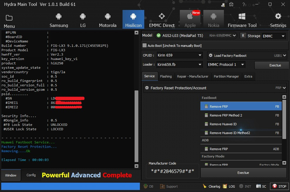 Hisilicon AGs2-L03 (MediaPad T5) FRP successfully removed by Hydra Main Tool
