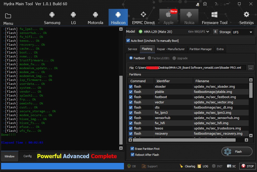 Huawei HMA-L29 (Mate 20) Flashing successfully done with Hydra Main Tool