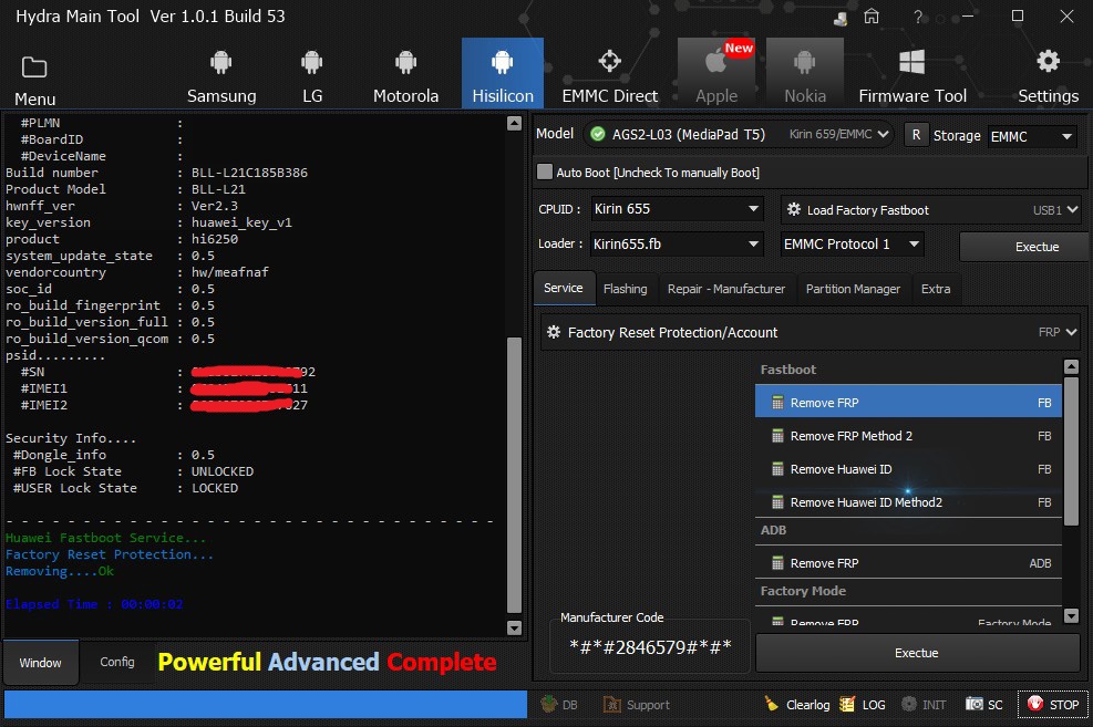 Huawei AGS2-L03 (Media Pad T5) Hisilicon removing FRP successfully done by Hydra Tool