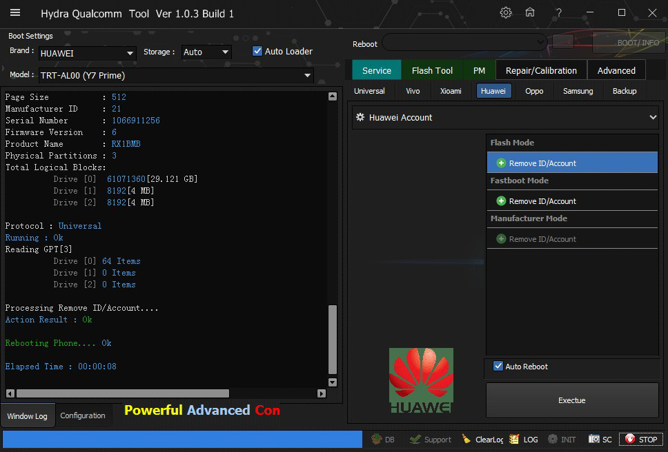 Huawei TRT-Al00 (Y7 Prime) removed ID and account successfully done by Hydra Tool