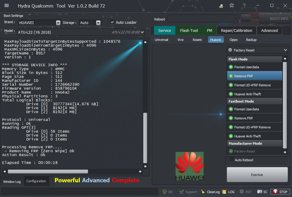 Huawei ATU-L22 (Y6 2018) Zero wipe FRP successfully removed by Hydra Tool