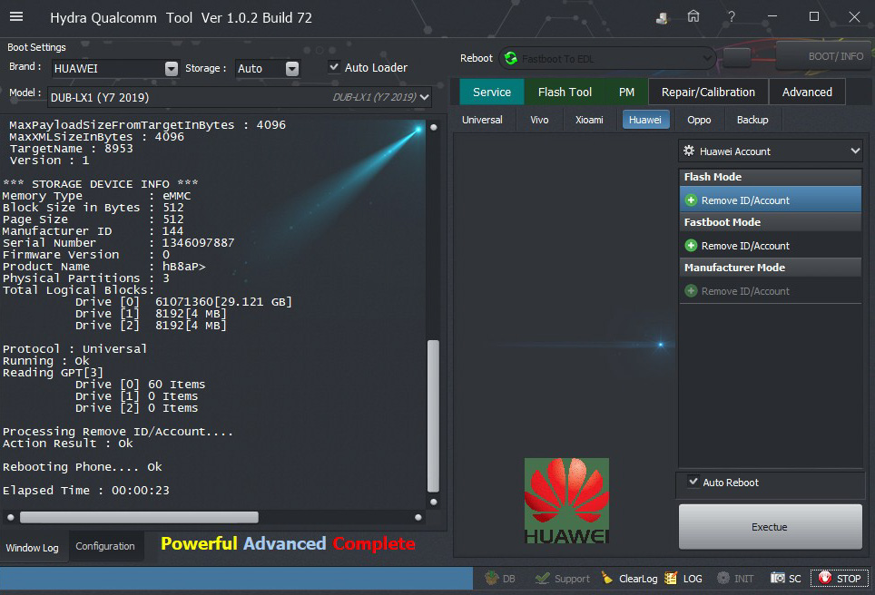 Huawei DUB-LX1 (Y7 2019) ID or Account remove successfully done by Hydra Tool