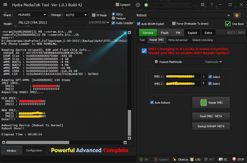 Huawei FRL-23 (Y9A 2021) 2 IMEI repaired successfully done by Hydra Tool
