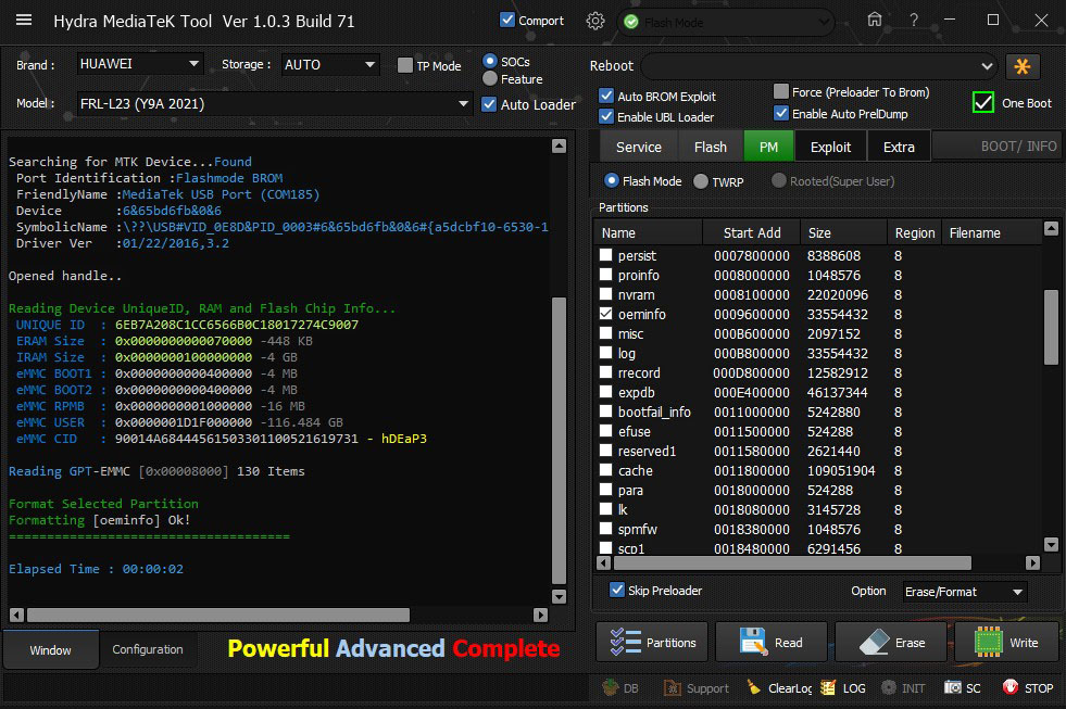 Huawei FRL-L23 (Y9A 2021) formatting selected partition successfully done by Hydra