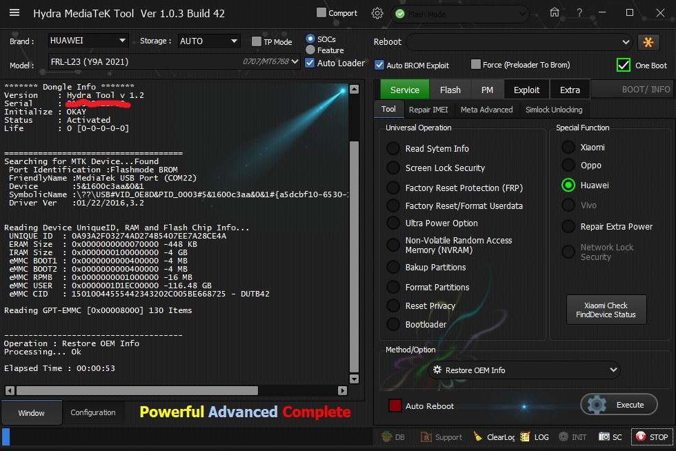 Huawei FRL-L23 (Y9A 2021) Restore OEM info successfully done by HYDRA TooL