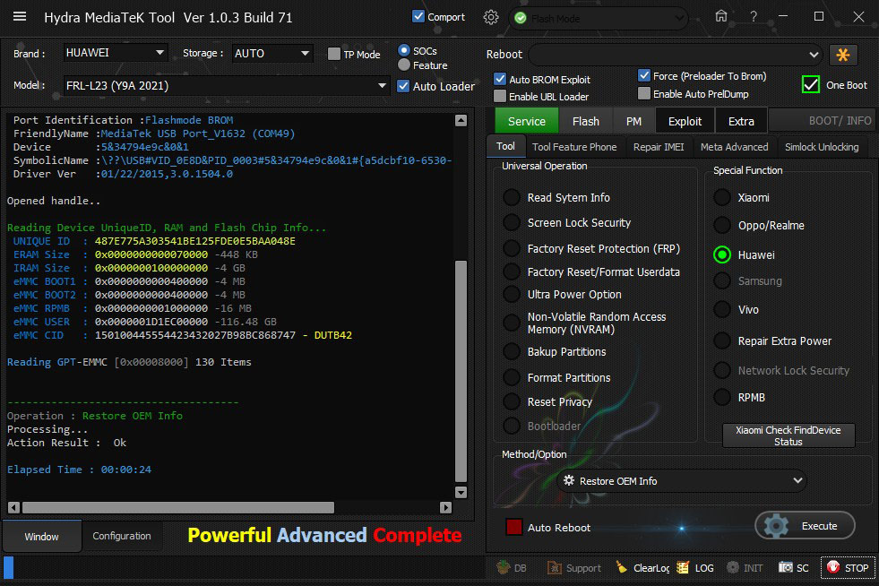 Huawei FRL-L23 (Y9A 2021) Restore OEM info successfully done by Hydra Tool