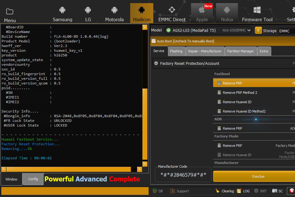 Hydra Huawei Hisilicon (AGS2-L03) MediaPad T5 removing Huawei Account successfully done by