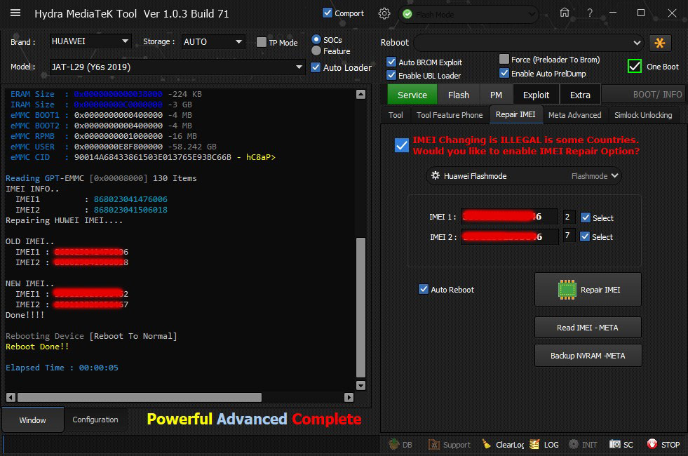 Huawei JAT-L29 (Y6s 2019) Both IMEI repaired Successfully done by Hyhdra Tool