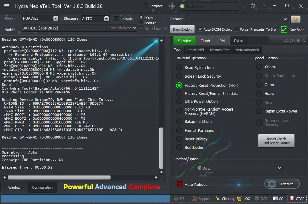 Huawei JAT-LX3 (Y6s 2019) Factory Reset Protection (FRP) successfully Removed by Hydra