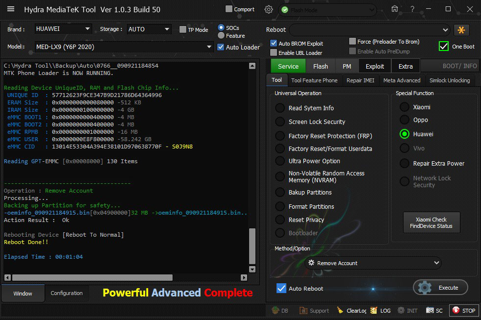 Huawei LX9 (Y6P 2020) Remove Huwa Account successfully done by Hydra Tool