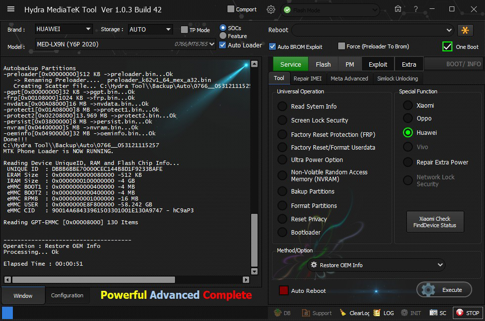 Huawei MED-LX9X (Y6P 2020) Restore OEM info successfully done by Hydra Tool