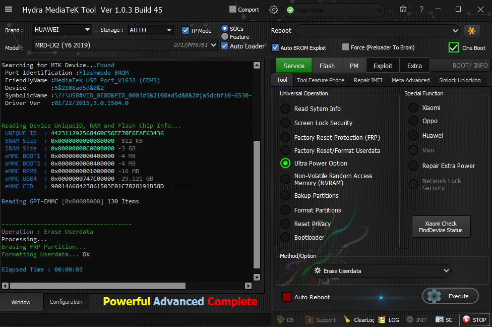 Huawei MRD-LX2 (Y6 2019) erased user data successfully done by Hydra Tool