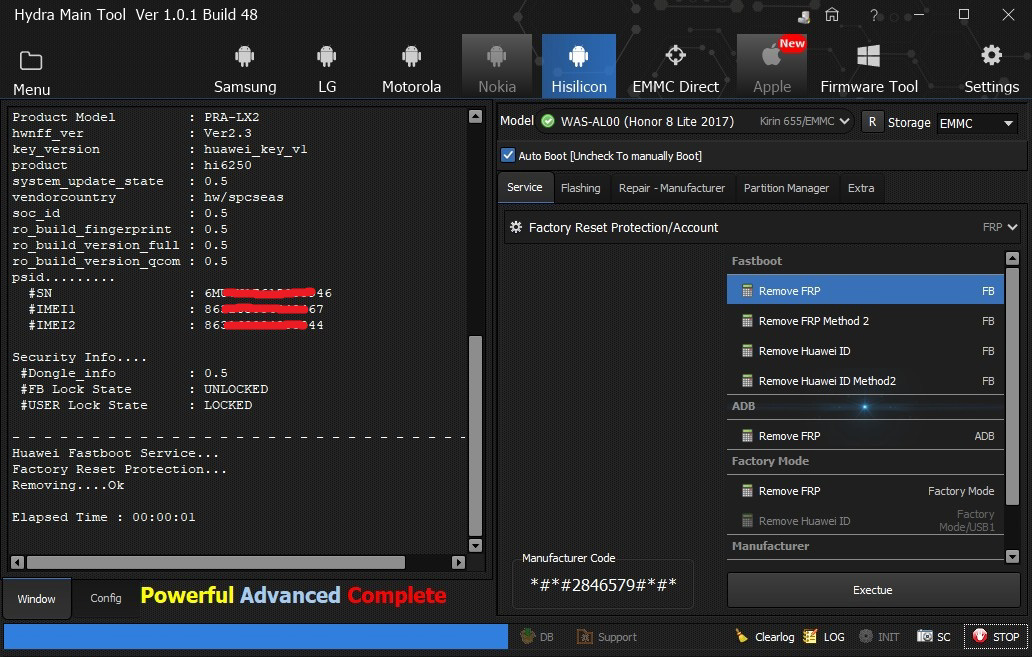 Huawei WAS-AL00 (Honour 8 Lite 2017) Remove FRP sucessflly done by Hydra Tool