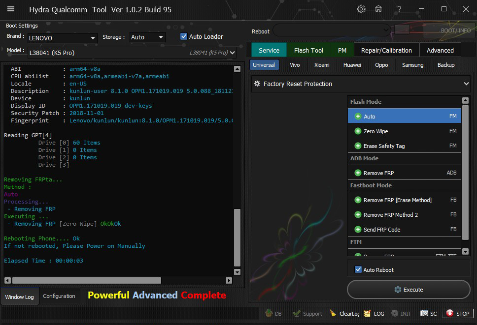 Lenovo L38041 (K5 Pro) Zero Wipe FRP successfully done by Hydra Tool