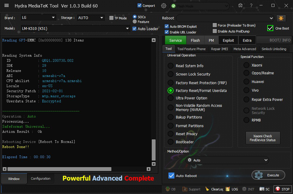 LG LM-K510 (K51) Factory Reset (Format user data) successfully done by Hydra Tool