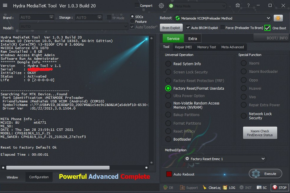 Mediatek MT6771 Factory Reset EMMC method successfully Done by Hydra Tool
