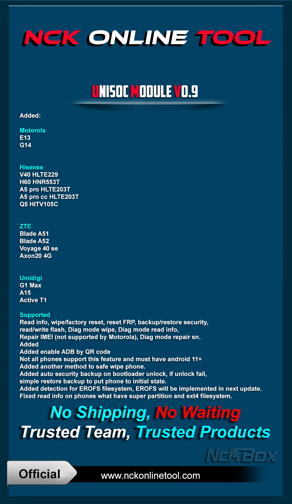 Supported read info, wipe/factory reset, reset FRP, backup/restore security, read/write flash, Diag mode wipe, Diag mode read info, repair IMEI (not supported by Motorola), Diag mode repair sn.