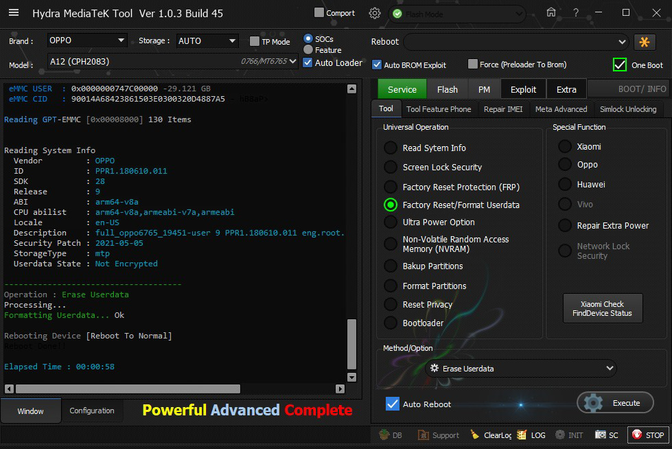 Oppo A12 (CPH 2083) Formatting user data successfully done by Hyda Tool