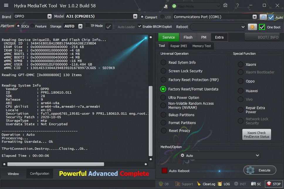 Oppo A31 (CPH2015) Formatting user data successfully done by Hydra Tool