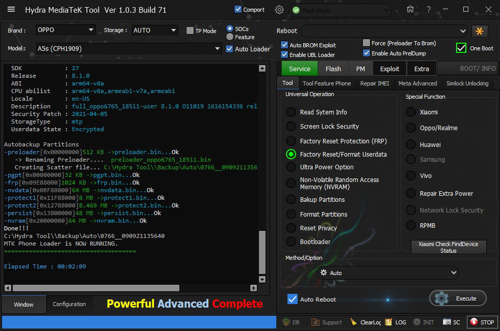 Oppo A5s (CPH 1909) Factory Format (FRP) successfully removed by Hydra Tool