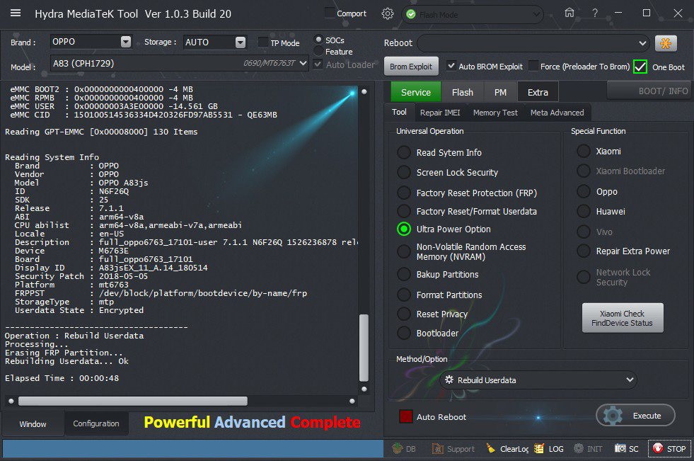 Oppo A83 (CPH1729) rebuilding user data successfully done by Hydra Tool
