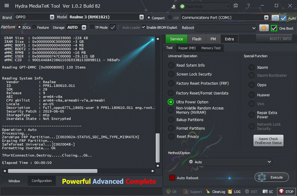 Oppo Realme 3 ( RMX1821) Formatting User Data Successfully Done by Hydra Tool