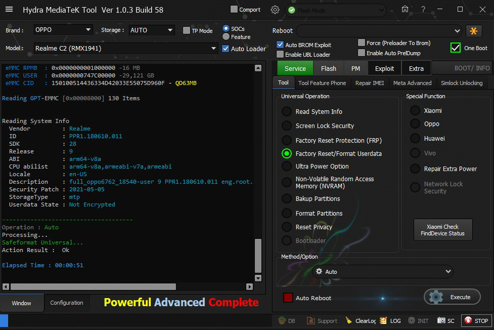 Oppo Realme C2 (RMX1941) Factory Reset successfully done by Hydra Toolo