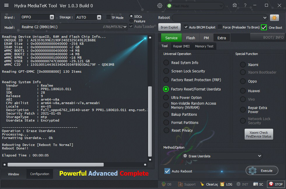 Oppo Realme C2 (RMX1941) Formatting user data successfully removed by Hydra Tool