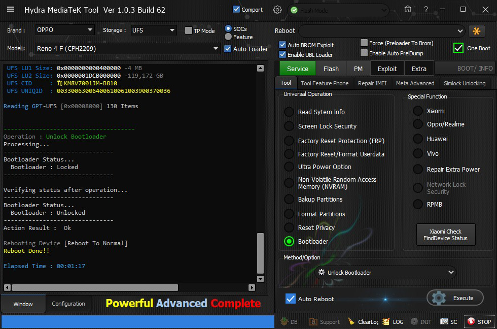 Oppo Reno 4F (CPH 2209) Unlock Bootloader successfully done by Hydra Tool