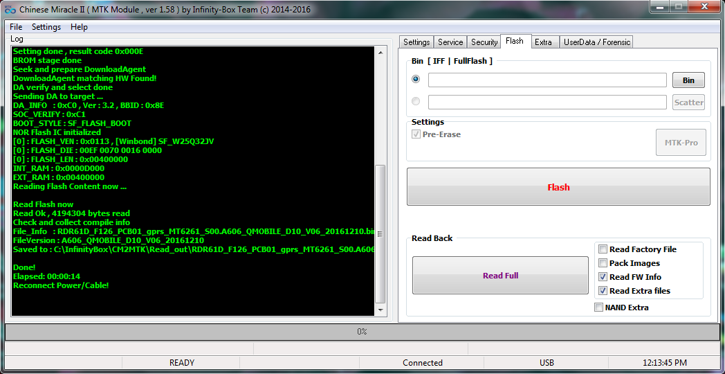 Saved to : C:\InfinityBox\CM2MTK\Read_out\RDR61D_F126_PCB01_gprs_MT6261_S00.A606_QMOBILE_D10_V06_20161210.bin