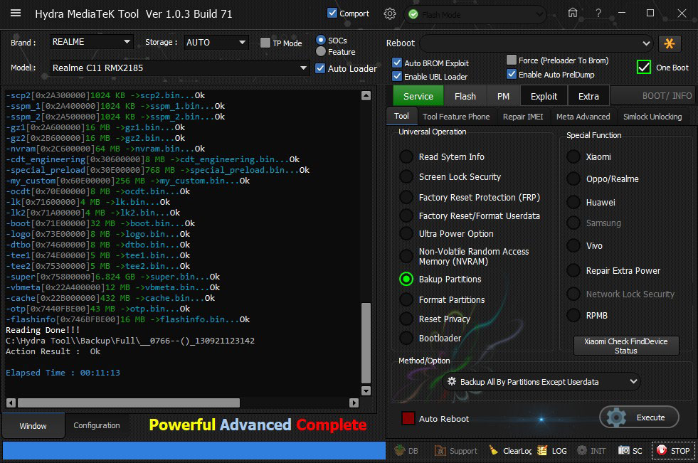 Realme C11 RMX2185 backing up partition successfully done by Hydra Tool