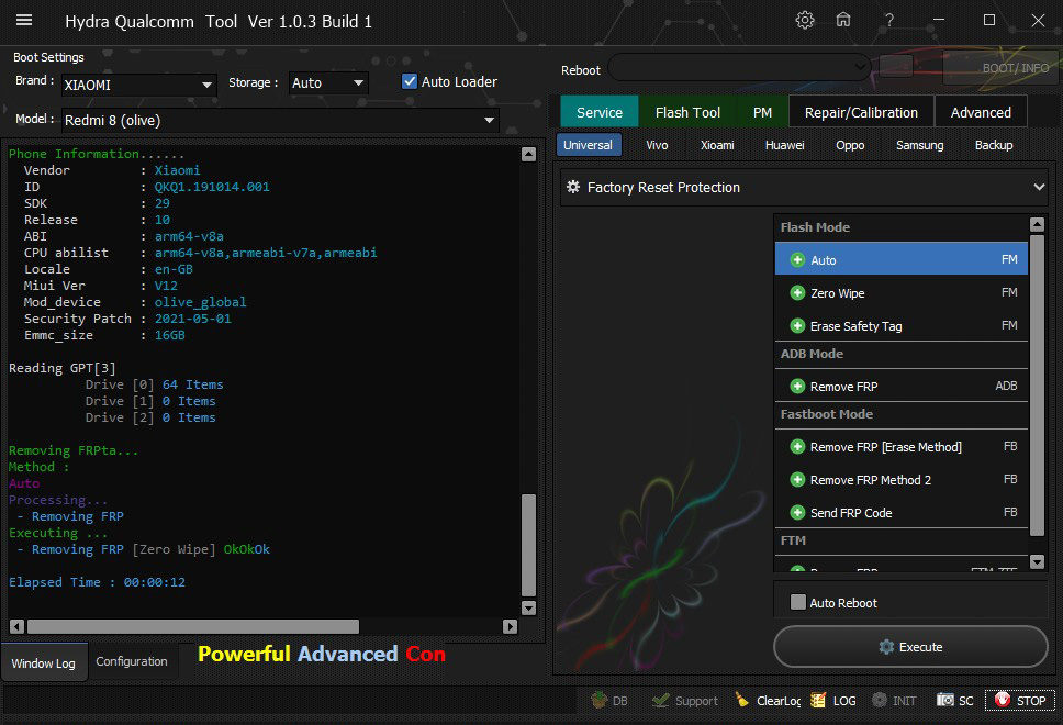 Redmi 8 (Olive) removed FRP zero wipe within seconds by Hydra Tool
