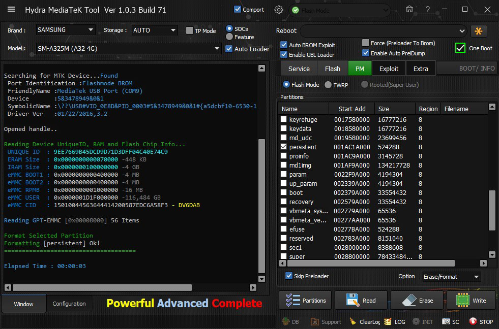 Samsung SM-A013F (A01 Core) formatted selected partition to remove frp done by Hydra