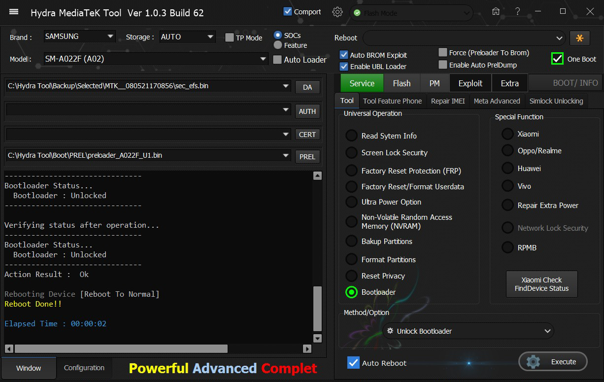 Samsung SM-A022F (A02) Unlock Bootloader successfully done by Hydra