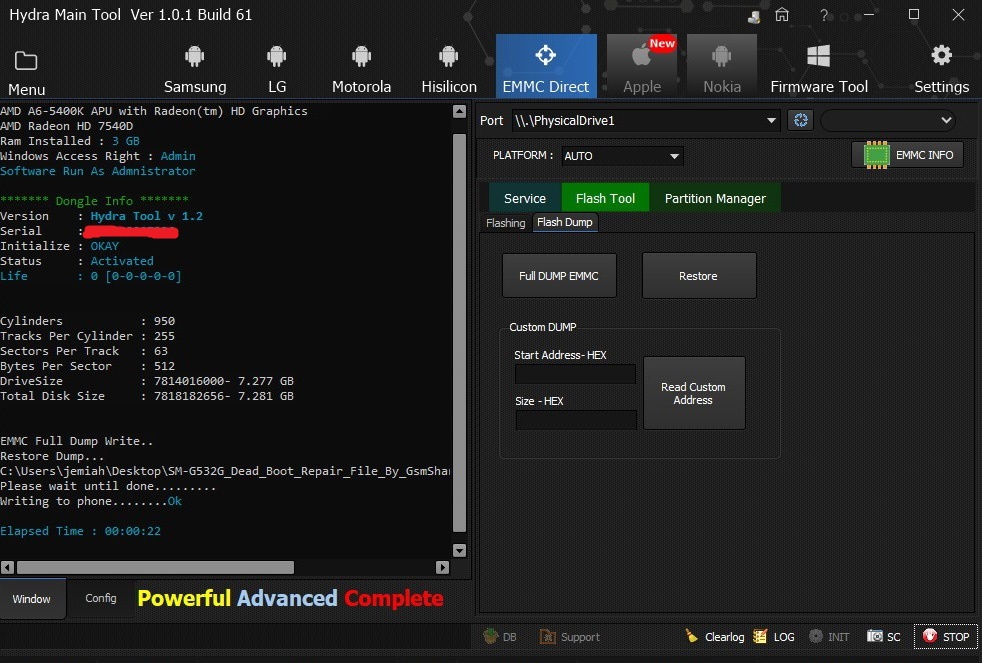 Samsung SM-G532G Dead Boot Repair using EMMC Tool successfully done Hydra Main Tool