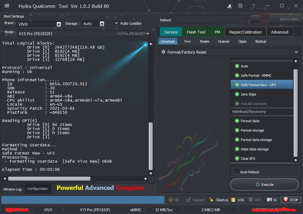 Vivo V15 Pro (PD1832F) safe format UFS successfully done by ELD mode by Hydra