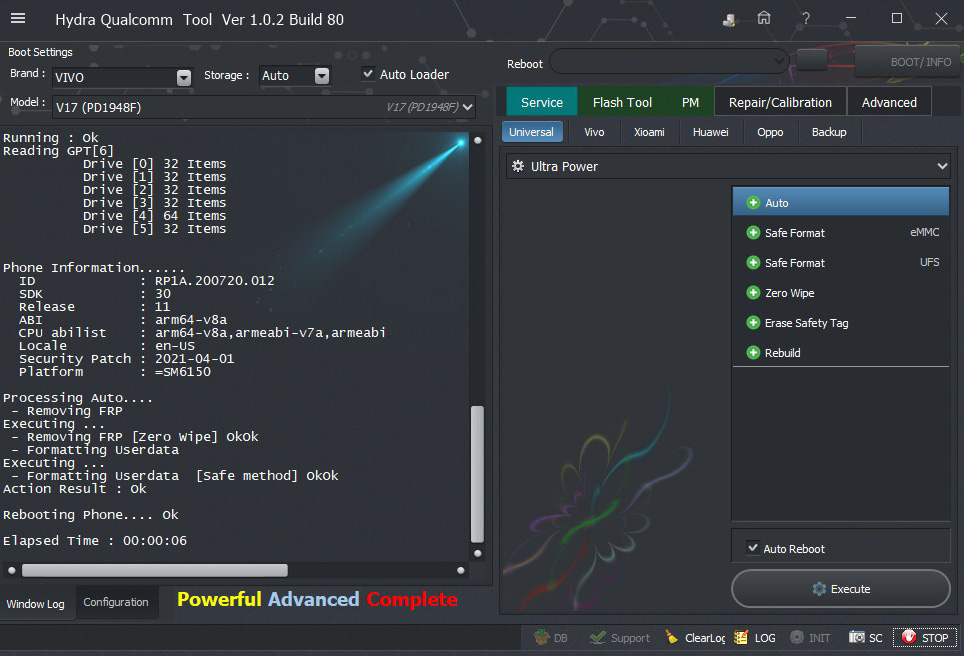 Vivo V17 (PD1945F) safe format user data and zero wipe successfully done by Hydra Too