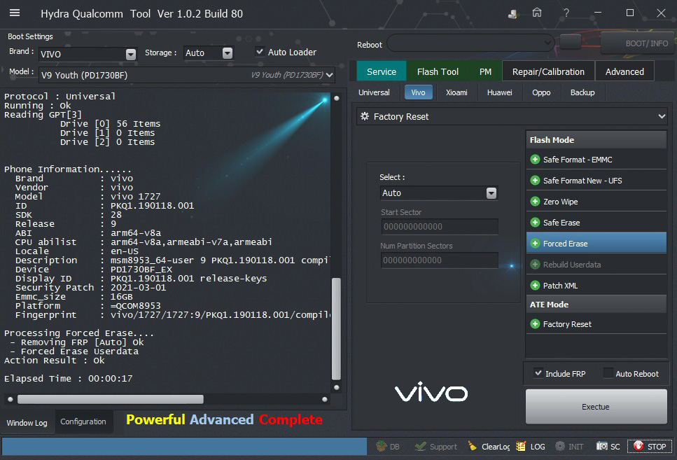 Vivo V9 Youth (PD1730BF) forced erased to remove FRP successfully done by Hydra Tool