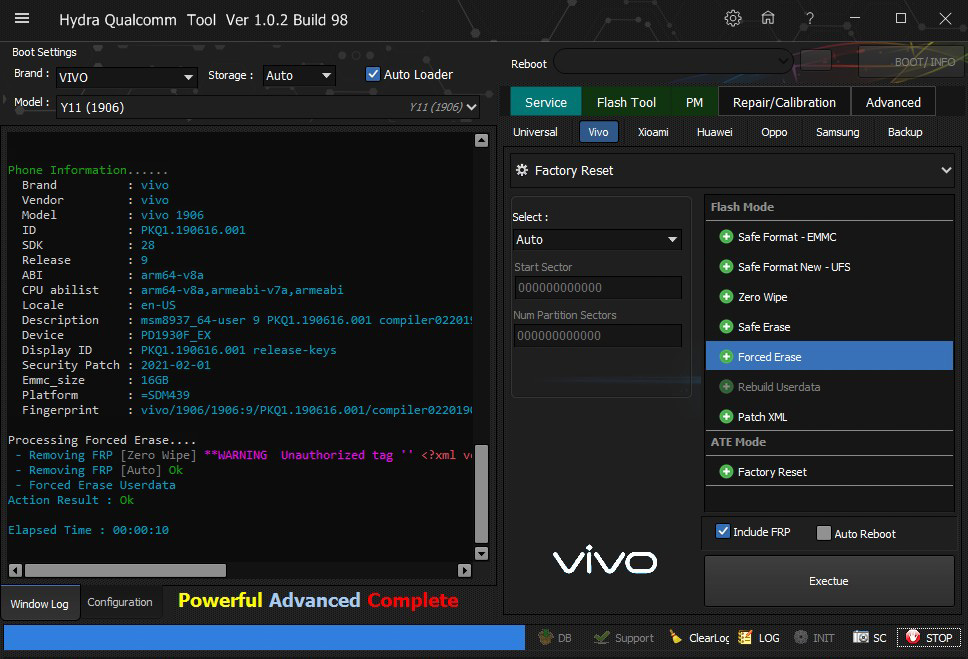 Vivo Y11 (1906) removing user data successfully removed by Hydra Tool