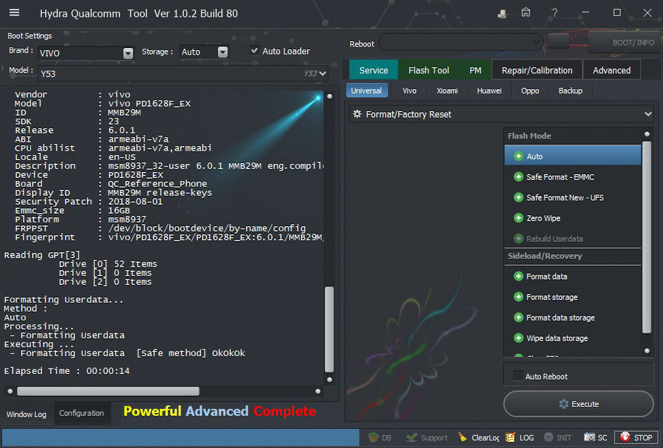 Vivo Y53 formatting user data safe method successfully done by Hydra Tool