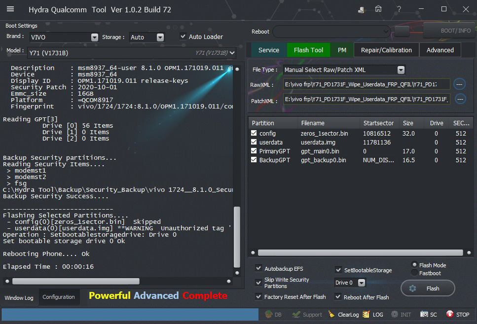 Vivo Y71 (V1731B) EDL selected partitions is flashed by Hydra Tool