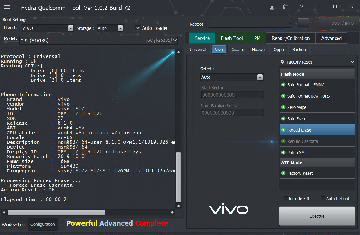 Vivo Y91 (V18158C) Forced erased User Data successfully Removed by Hydra Tool