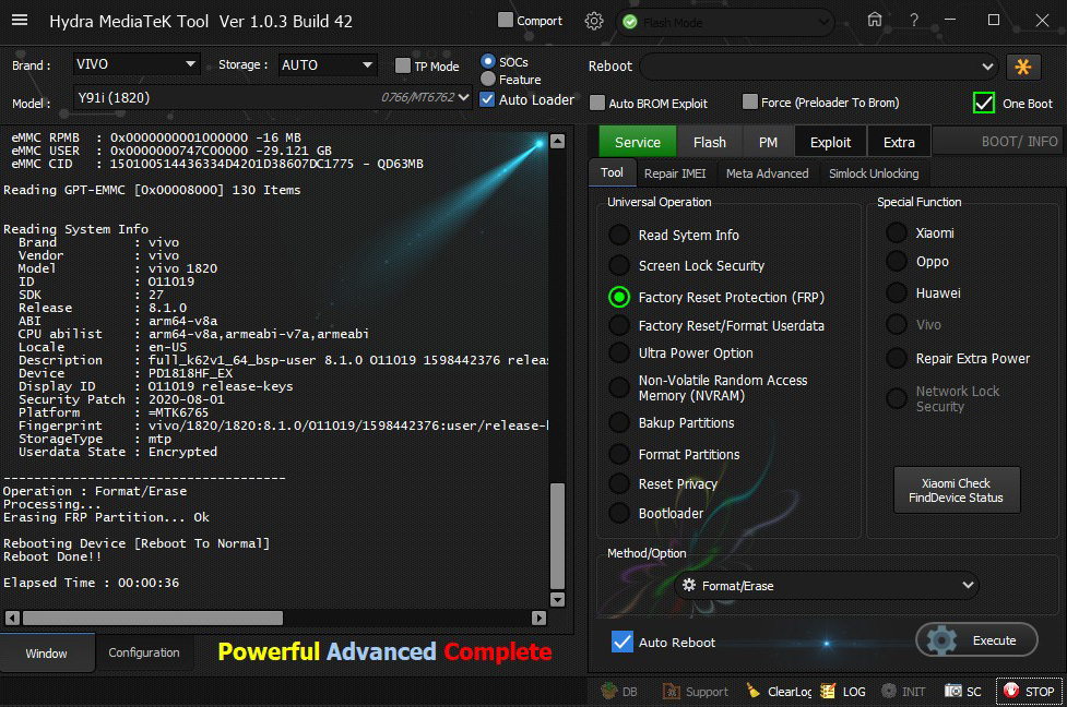 Vivo Y91i (1820) erasing FRP Partition is successfully done by Hydar Tool