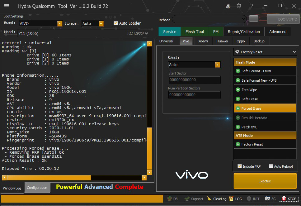 Vovo Y11 (1908) FRP Remove and Erasing user data successfully Done by Hydra Tool