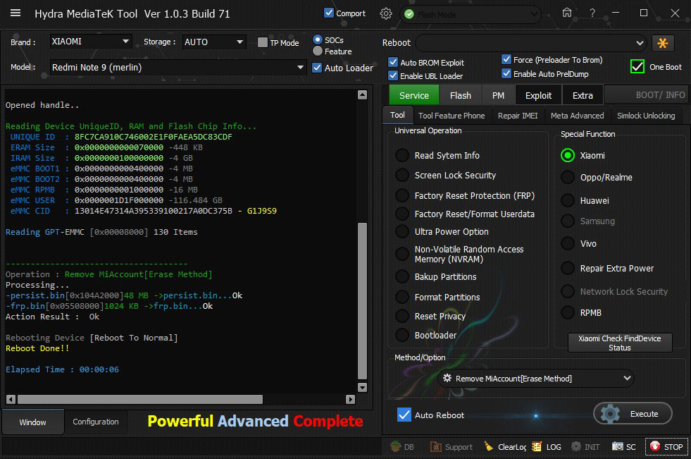 Xiaomi Readmi Note 9 (Merlin) Mi Account successfully removed by Hydra Tool