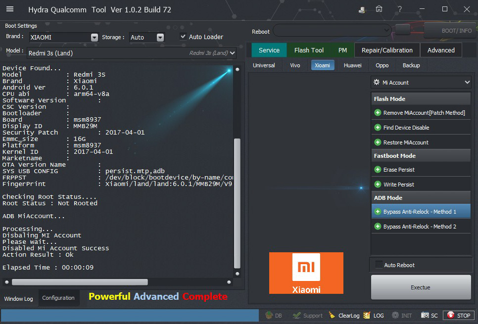 Xiaomi Redmi 3s Land Disabled Mi Account successfully done by Hydra Tool