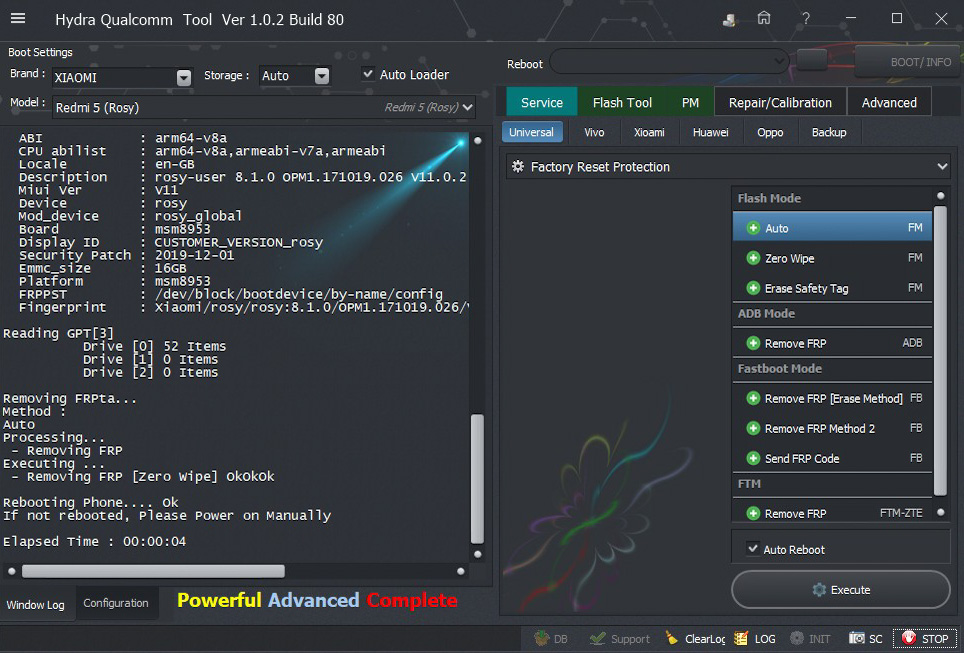 Xiaomi Redmi 5 (Rosy) FRP Zero Wipe successfully done by Hydra Tool