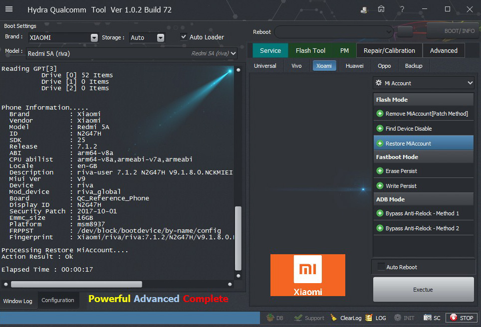 Xiaomi Redmi 5A (riva) restoring Mi Account successfully done by Hydra Tool